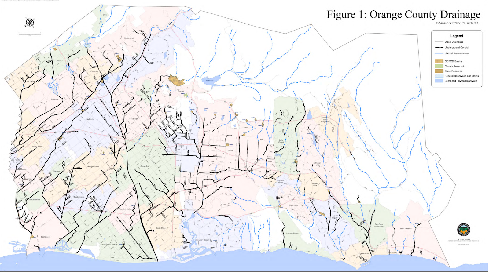 Map of all the waterways (in black) that OCPW is permitted to spray herbicides in, pg 8 Orange County Public Works Aquatic Pesticide Application Plan.